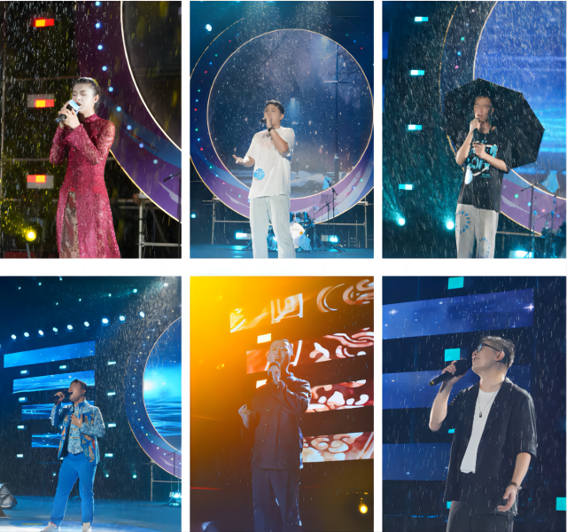 經(jīng)過第一輪的競唱后,剛停歇的大雨仿佛也被歌聲感染,開始如注而下,但絲毫沒有阻擋歌手、觀眾的熱情,現(xiàn)場卻沒有一個(gè)人離去。隨著一段悠揚(yáng)、極具電影感的“雨中薩克斯”表演,將音樂節(jié)推向一個(gè)新的階段,主持人在雨中主持,選手在雨中激情歌唱,觀眾們打起傘、披上雨衣冒雨觀看,歌聲、雨聲、伴奏交相輝映,演繹了一場經(jīng)典而深刻的“雨中音樂節(jié)”。