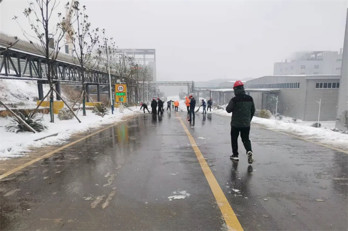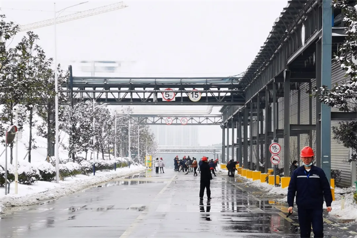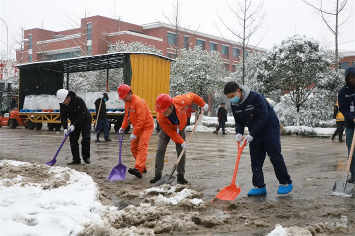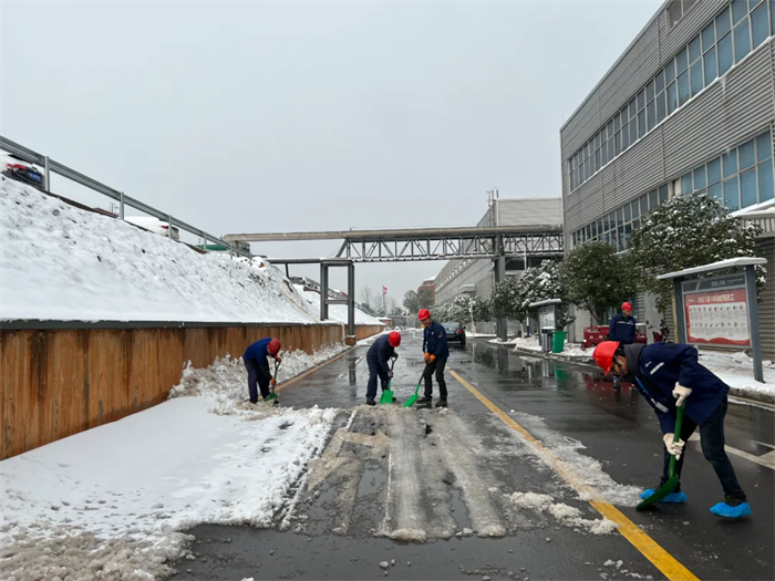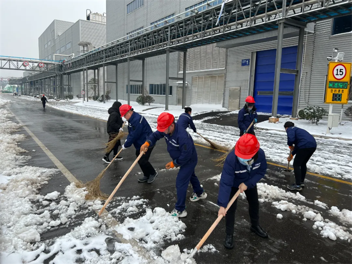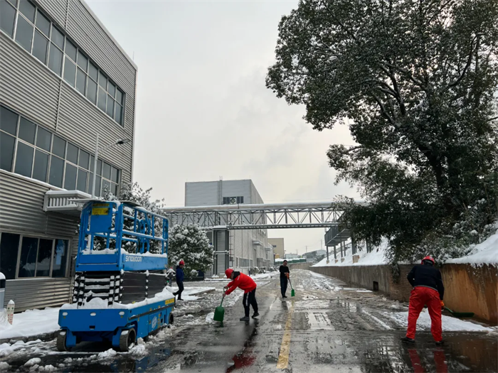面對突如其來的大雪,西部、中部產(chǎn)業(yè)基地迅速形成系統(tǒng)完備、科學(xué)規(guī)范、運行有效的掃雪除冰工作體系——EHS部通過提前考察研判、及時發(fā)布警示通知、成立應(yīng)急工作小組等方式積極應(yīng)對,對現(xiàn)場情況仔細(xì)巡檢,組織人員清掃主干道區(qū)域積雪、潑灑鈉鹽,對被積雪壓斷樹枝影響通行的路段進(jìn)行封閉和設(shè)置警戒標(biāo)志。與此同時,行政后勤全力調(diào)度,加開通勤班車、布置臨時客房、熬制暖身姜茶……全力做好后勤保障工作。